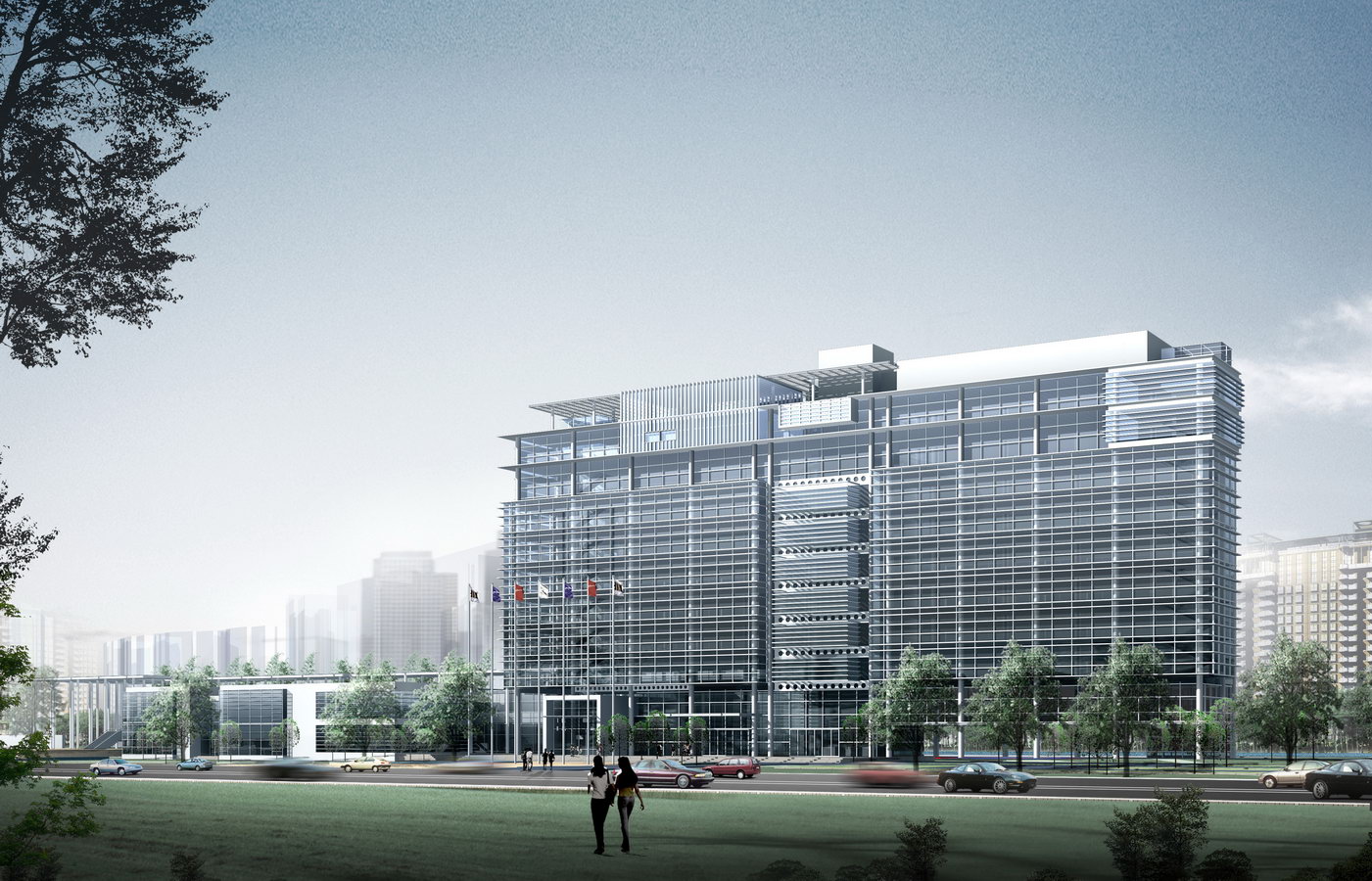 业主要求两个具有很强识别性的建筑体量:主楼供员工办公,11层,建筑面积10,000m2;附楼用于投资商的接待及会议,2层,建筑面积3,000m2。设计构思强调了主楼与附楼不同的空间特质:主楼面向太湖大道,附楼分散布置在河边,与沿河景观内外交融,一条纯净的玻璃连廊将主楼与附楼联系在一起。
